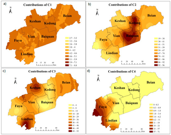 Spatial distributions of contribution rates of soil particle size-sensitive components. (a) C1 component; (b) C2 component; (c) C3 component; and (d) C4 component.