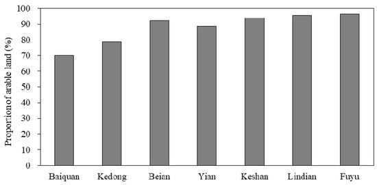 Proportion of arable land of different locations (%).