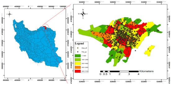 The data used in this study includes population data, spatial data, and locations data of the taxis drop-off and pick-up locations. The population data and the spatial data were obtained from the Iranian Statistical Center. Data about the pick-up and the drop-off of the taxis were collected from 137 taxis between 1 November 2018 to 26 December 2018. The accuracy of this data includes from the time level every 20 s, and at the spatial level involves every 5 m. The data was downloaded from the Hamsi application, which is the online taxi request software, that belongs to the Sako Company in Bojnourd city. The taxis data contains 20,008,969 records, and it is formatted to the raw points for the passenger’s pick-up and drop-off points. Each data record includes information about the taxi id, speed, position, time, direction, and whether or not the taxi is carrying a passenger, which is the status. Table 1 shows a recorded example of the taxi data. Figure 1 shows the location of Bojnourd city in Iran, which includes the population’s spatial distribution and the spatial distribution of the pick-up and drop-off points.