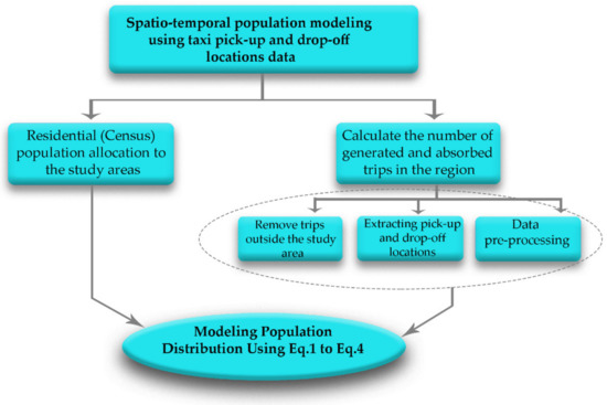 Understanding the spatial-temporal structure of modern cities has been made possible with the discovery of the population movement patterns [12]. The traveling actions of individuals can be analyzed using new sources of evidence. The vast volumes of data obtained from smartphones, metros, busses, and social media have helped to explain the patterns of human travel, urban dynamics, and spatial experiences [13,14,15,16]. Global Positioning System (GPS) data is able to identify people’s movement behavior due to its unique features. Therefore, data from GPS systems provide a better understanding of the population movement behavior over time and space [17]. Yuan and Le Noc [18] examined urban movement using GPS data. The distance and the direction of travel are determined by the pick-ups and the drop-offs. The number of pick-up locations and the average trip extent reflects the size and the scale of the mobility of different urban regions. The entropy index was used to determine the direction of travel, and the hourly mobility pattern similarity was calculated using the Dynamic Time Warping (DTW) algorithm. Gong et al. [19] used taxis data to discover travel patterns. Shen et al. [20] examined the pattern of the population movement, and they studied the number of generated and absorbed trips using taxi data. In the studies mentioned above, the pick-up and drop-off taxis data is widely used in order to identify the human movement patterns as opposed to population estimation and modeling. Therefore, the big data of taxi origins and destinations can be used in many spatial analyzes.