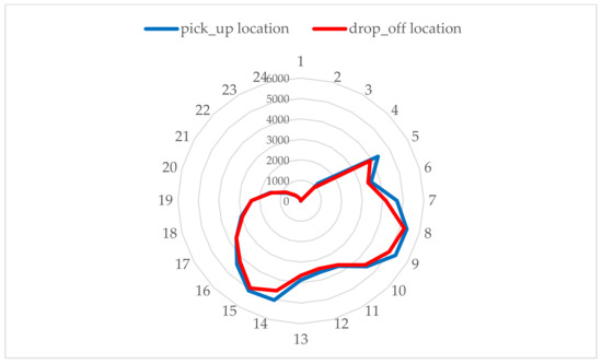 In this research, Bojnourd’s GPS taxis data was used for the spatial-temporal modeling of the urban population. After processing the data, the number of generated trips, which included the number of pick-up locations, and the absorbed trips, which included the number of drop-off locations, per hour was obtained. Figure 3 depicts the number of pick-up and drop-off locations per hour.