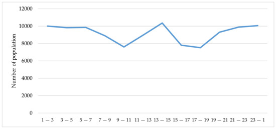 where DP denotes the population of the area during the day, CP is the statistical population of the region, and Pd denotes the population entering the area. It is calculated from the number of drop-off locations, which is also called the absorbed trips (NDO). Pp is the population of the area leaving it, and it can be calculated by the number of pick-up locations in the region, which is also called the generated trips (NPU). α is the percentage of the trips made by the citizens of Bojnourd city using taxis. The α value in this study is 18.08%. The hourly population of the region can also be obtained using the Equation (4) [21].