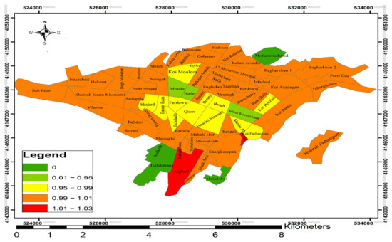 Figure 5 shows the spatial distribution of the day to night population ratio of Bojnourd. Figure 5 shows that neighborhoods with high population ratios are more concentrated in the neighborhoods from Shahrak Alghadir, Dabaghkhane, Bagh Aziz, Bagh Motahari, and Taher Gholam, which include with 1.039, 1.021, 1.015, 1.012, and 1.011 ratios, respectively. The higher day to night population ratio in a given area can indicate a greater proportion of commercial land-use than the proportion of residential land use.