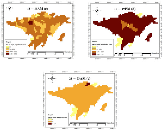 Spatial-temporal distribution of the day to night population ratio (a) for 3–5, (b) for 7–9, (c) for 11–13, (d) for 17–19, and (e) for 21–23.