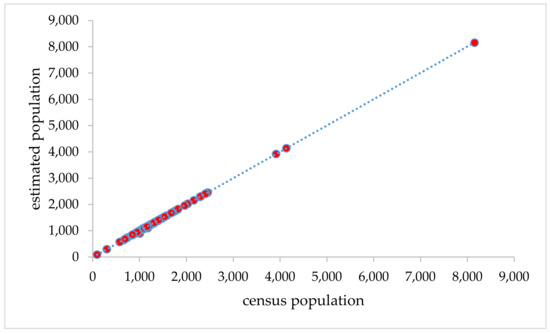 In order to verify the validity and the appropriateness of our model, a regression analysis was performed between the measured values, which included the census population residing at night and the predicted value, which included the calculated population at 21:00 to 23:00 using Equation (4). Figure 8 presents the census population, which was obtained from the Statistics Center of Iran according to the latest population and housing census (2016), versus the evaluated overnight population from 21:00 to 23:00. The regression analysis showed that the model performs well for the neighborhood day population. The coefficient of determination for the model (R2) is 0.9998, and the mean square error is 10.78. The evaluated total night population is only 0.4% lower than the census population.