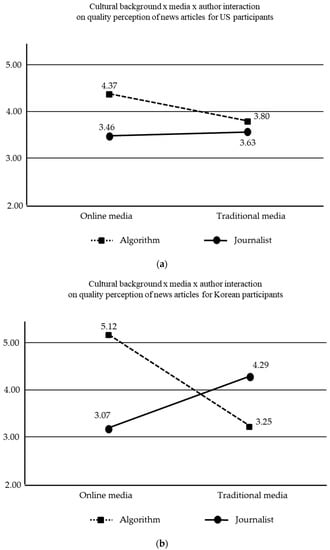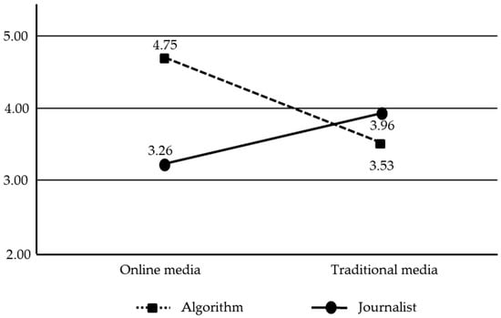 As has been suggested by previous studies in this field, we used an experimental design because this approach allows for the manipulation of variables and ensures internal validity [7,10]. In this study, we employed a 2 (author: algorithm vs. human journalist) × 2 (media: traditional media vs. online media) × 2 (cultural background: the US vs. South Korea) between-subject design. To test H1 and H2, we conducted a series of ANOVA tests, the results of which revealed a significant main effect according to the type of author (i.e., journalist or algorithm) (F (1, 352) = 15.826, p < 0.05). In other words, it showed that both the US and Korean participants perceive the quality of news articles generated by algorithms (M = 4.13, SD = 0.95) to be higher than those written by human journalists (M = 3.60, SD = 0.73). Therefore, H1 was fully supported. Then, H2 predicted that news readers would perceive the quality of news differently by the interaction effect of authors and media. As predicted, the analysis revealed a significant interaction effect (F (1, 352) = 62.826, p < 0.05). According to the result of carrying out a planned contrast to examine the detailed interactions between variables, when news users read the news in traditional media, they perceived the quality of news articles written by human journalists (M = 3.96, SD = 0.57) to be higher than those generated by algorithms (M = 3.53, SD = 0.87; F (1, 178) = 14.992, p < 0.05). However, when reading through online media, they perceived the quality of algorithm-generated news (M = 4.75, SD = 0.57) to be better than human journalists’ work (M = 3.26, SD = 0.68). This result indicates that the perception of the quality of news articles written by journalists or algorithms varies depending on the medium of news dissemination; F(1, 178) = 78.193, p < 0.05) (See Figure 1).