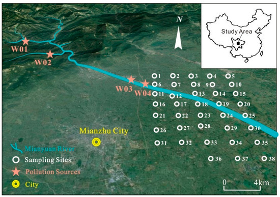 To investigate the factors influencing Cd and Pb pollution in the Mianzhu region’s farmland topsoil, the study area was divided into several blocks, from which samples were collected. A field investigation was conducted to individually investigate the pollution sources in the vicinity of the study area. Samples of pollution sources were collected from mines, residential areas and industrial areas in the upstream region of the study area.