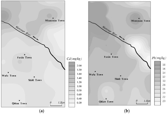 Spatial distribution of soil Pb and Cd concentrations around Mianyuan River. (a) Spatial distribution of soil Cd; (b) spatial distribution of soil Pb.