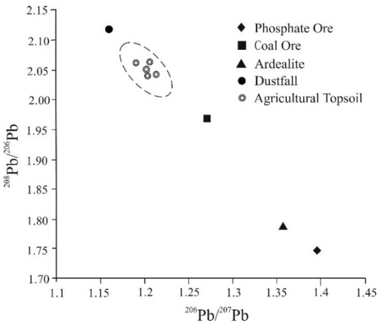 Although phosphate and coal mining activities, as well as phosphating plants, are likely to be the main sources of lead in the study area, atmospheric coal burning, and automobile exhaust emissions also need to be considered. The emission of automobile exhausts and the burning of coal cause atmospheric depositions [18]. Zhao et al. found that the isotopic composition of lead in automobile exhausts was between 1.150 and 1.162 () and between 2.106 and 2.115 () [46]. The value range of the isotopes of the dustfall in the study area ( = 1.163, = 2.114) is close to the value range of automobile exhaust, but far from that of the coal mine, phosphate ore and phosphogypsum. In addition, the study area has a well-developed transportation infrastructure, with a large volume of traffic and automobile exhaust emissions. This indicates that the source of the dustfall in the study area is dominated by automobile exhaust deposition.
