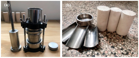 The oven dried base soils (sand, kaolin and bentonite) were thoroughly mixed with XG, after which distilled water was added [25,29]. The sample preparation was in accordance with standard geotechnical testing method (GB/T 50123-2019, China). A homogeneous XG-soil substrate was obtained through a manual mixing and then placed inside a mounted cylindrical mould (39.1 mm diameter and 80 mm height) in three layers. For each layer, 25 blows were applied through a 305.5 g rammer dropping from a 247 mm height. The energy delivered by this compaction procedure was 577.7 kN·m/m3, which was slightly smaller than that from standard proctor compaction (600 kN·m/m3) in accordance with ASTM D698. After compaction, the samples were extruded out of the mould as shown in Figure 1 and cured in a controlled environment (60% relative humidity and 20 °C). A curing period of 14 days was adopted as the growth rate of mechanical strength was observed to be lowered after 14 days [12,23,68]. The UCS test were conducted under the strain-controlled condition at a loading rate of 1.5%/min in accordance with ASTM D2166 at the end of 14-day curing period. For each treatment condition, triplicates were measured to obtain average UCS values. It should be noted that it was difficult to obtain certain densities for all specimens with several XG contents, initial moisture contents and soil compositions. Therefore, all specimens were prepared at the maximum density according to their compaction as aforementioned, which was also adopted by [20]. For each treatment condition, the dry density was tested at the moment of sample preparation before curing. As shown in Table 2, there exists a range of dry density for each soil composition due to various XG contents and initial moisture contents.