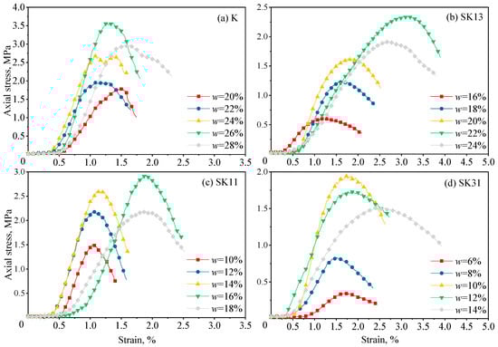 Typical stress–strain behaviours of XG-treated sand–kaolin mixtures with various initial moisture contents (3% XG). (a) K (pure kaolin), (b) SK13 (mass ratio of sand to kaolin = 1:3), (c) SK11 (mass ratio of sand to kaolin = 1:1), (d) SK31 (mass ratio of sand to kaolin = 3:1).