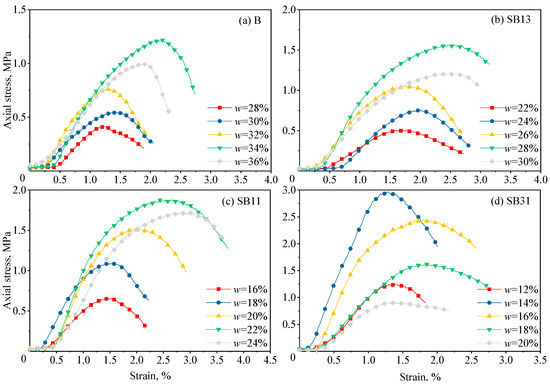 Typical stress–strain behaviours of XG-treated sand–bentonite mixtures with various initial moisture contents (3% XG). (a) B (pure bentonite), (b) SB13 (mass ratio of sand to bentonite = 1:3), (c) SB11 (mass ratio of sand to bentonite = 1:1), (d) SB31 (mass ratio of sand to bentonite = 3:1).