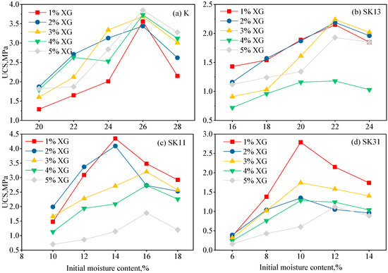 Relationship between UCS and XG content for different initial moisture contents. (a) K (pure kaolin), (b) SK13 (mass ratio of sand to kaolin = 1:3), (c) SK11 (mass ratio of sand to kaolin = 1:1), (d) SK31 (mass ratio of sand to kaolin = 3:1).