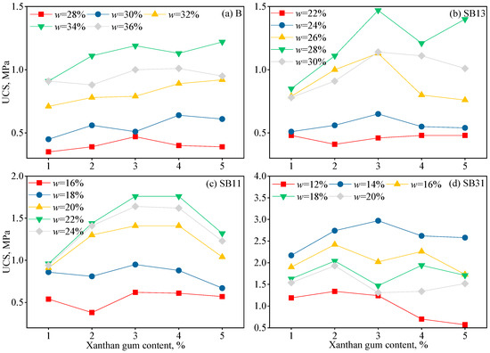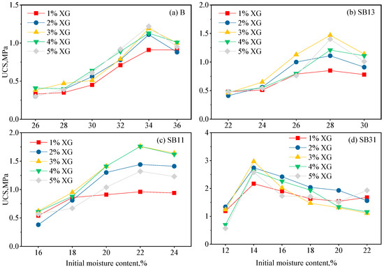 Relationship between UCS and XG content for different initial moisture contents. (a) B (bentonite), (b) SB13 (mass ratio of sand to bentonite = 1:3), (c) SB11 (mass ratio of sand to bentonite = 1:1), (d) SB31(mass ratio of sand to bentonite = 3:1).