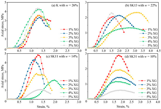 Stress–strain relationships for the XG-treated sand–kaolin mixtures with various XG contents. (a) K (pure kaolin), (b) SK13 (mass ratio of sand to kaolin = 1:3), (c) SK11 (mass ratio of sand to kaolin = 1:1), (d) SK31 (mass ratio of sand to kaolin = 3:1).