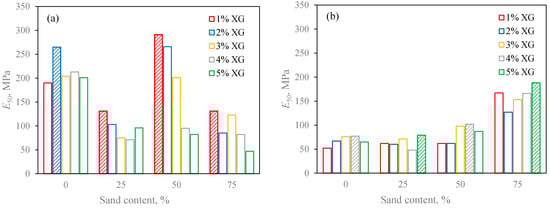 Relationship of deformation modulus E50 versus sand content for different XG contents. (a) Sand–kaolin mixtures, (b) sand–bentonite mixtures.