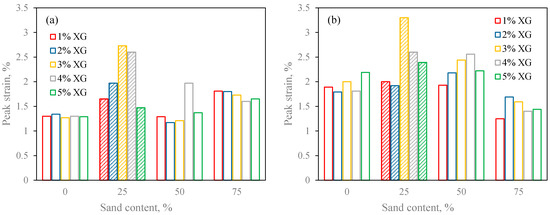 Relationship of peak strain versus sand content for different XG contents. (a) Sand–kaolin mixtures, (b) sand–bentonite mixtures.
