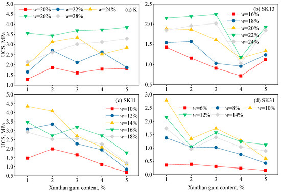 The UCS values of pure kaolin and sand–kaolin mixtures are plotted against the XG contents in Figure 10. It can be seen that the trends of UCS might be considered roughly the same for five initial moisture contents, given an identical soil composition. Pure kaolin seemed to gain strength as the XG content gradually increased from 1% to 5%, while sample SK31 with 25% clay content had a decreasing trend of UCS with the increasing XG content. For samples SK13 and SK11 with 75% and 50% clay contents, respectively, there seemed to be an optimum XG content between 1–5% XG leading to the maximum UCS. Figure 11 also indicates that the UCS variations with XG contents was identical to some extent for a given soil composition (or sand content) and diverged as the soil composition changed. As can be seen, there existed an optimum XG content for each soil composition. Excessive XG content might lead to either ionic repulsion or hydrological swelling [35] and impair the consequent strength improvement of the XG-treated sand–clay mixtures.