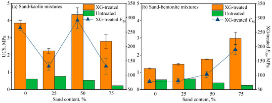 By contrast, the XG-treated sand–kaolin mixtures and sand–bentonite mixtures had much more different values of UCS; e.g., treated K and SK11 had UCS values of 3.85 MPa and 4.35 MPa which were around three times and 2.5 times the UCS values of the treated B (1.22 MPa) and treated SK11 (1.76 MPa), respectively. However, the treated soil mixtures with 75% sand content (SK31 and SB31) had comparable UCS values of 2.79 MPa and 2.97 MPa. Furthermore, Figure 13a,b show different trends of UCS as the sand content increased. For sand–kaolin mixtures, the XG was mostly effective in reinforcing the mixed soil with 50% sand content, by increasing the UCS from 0.53 MPa to 4.35 MPa by 700%. While the sand–bentonite mixtures had a trend of strength ever increasing with the increasing sand content. In addition, the values of E50 for treated sand–clay mixtures are presented in Figure 13 as well, showing similar trend with UCS. This phenomenon is in accordance with the test result from [72], in which E50 is linearly correlated with UCS.