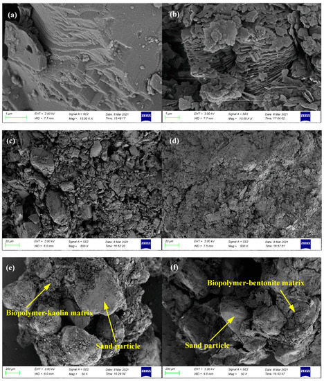 As can be seen from Figure 13, it is reasonable to conclude that XG might be more useful in reinforcing some particular fine soils, such as kaolin. This phenomenon might be explained as follows: Kaolin particles had higher edge charge and van der Waals force interaction than bentonite particles [45], and therefore the electrostatic interaction between the negative charged XG and the positive charged kaolin particles formed more well-bonded XG–clay matrix. On the other hand, the highly expendable nature of bentonite allowed the water molecules to enter the interlayer region [73,74]. Due to the hydrophilic property of XG, this water absorption behaviour was more remarkable for XG-treated soils than untreated soils. In summary, stronger ironic (or hydrogen) bonds between XG and kaolin and a more condensed microstructure made kaolin have better performances under XG treatment. An exception was found for SK31 and SB31. As can be seen in Figure 14e,f, xanthan gum did not directly interact with sand particle [35,75], while clay particles and xanthan gum monomers formed a well-bonded xanthan gum–clay matrix through hydrogen or ionic bonds [76,77]. Therefore, the strengthening behaviour of xanthan gum-treated sand–clay mixtures can be attributed to the formation of XG–clay matrix and the cumulation of XG-–clay matrix among sand particles. For SK31 and SB31 that had a sand content up to 75%, although the type of clay in XG–clay matrix had an effect on the strengthening efficiency, the mechanical strength would be largely controlled by the sand [53,54,78,79].