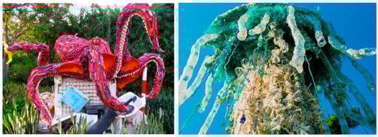 Her analogical tropes, particularly biological, suggest meaning through familiar points of reference [,,]. These analogies make obvious references and adopt a method of consensus and agreement for communicating an eco-lesson well known by the majority of viewers. The eco-lesson delivered is related to conspicuous consumption and is based on the notion of massive amounts of waste, particularly single-use plastics and the general debris of daily habits, even if much of this waste is an outcome of ecological production. Ecological production is a type of production practice that aims to adopt eco-efficiency measures in their design and construction process. They aim to reduce production impacts, but not consumption habits. This is a deep-seated problem, and one that occupies the imaginary of people around the world, especially since the discovery of large islands of single-use plastics polluting water systems and intoxicating fish, wildlife, and natural habitats (Figure 2). However, very few will ever have access to such ocean disasters. Pozzi’s work is intended to rouse visions of this “invisible” devastation by concretizing these visions along the shore. It is however, not clear if it is successful in terms of changing consumption habits, production processes, or the ways in which waste is managed. It does however create communities of practice around ocean trash and collection [,], even if this will not solve ocean plastic’s massively dispersed problem.