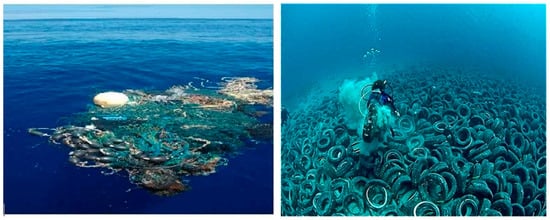 Left: ‘Great Pacific Garbage Patch’ is massive floating island of plastic, now 3 times the size of France (Source: https://abcnews.go.com/International/great-pacific-garbage-patch-massive-floating-island-plastic/story?id=53962147 accsessed on 15 October 2020). Right: Pile of automobile tires sunk into the Pacific. Images from the creative commons.