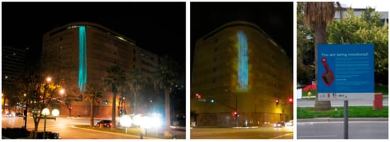 Left: Particle Falls provides a real-time visualization of particulate pollution in the San Fernando Corridor (Source Figure 3: http://01sj.org/2010/artworks/particle-falls/, accessed on 15 October 2020). Right: Billboard announcing the art installation (Source Figure 4: http://01sj.org/2010/artworks/particle-falls/, accessed on 15 October 2020). Work by Andrea Polli and Chuck Varga, San José, CA, USA, 2010.