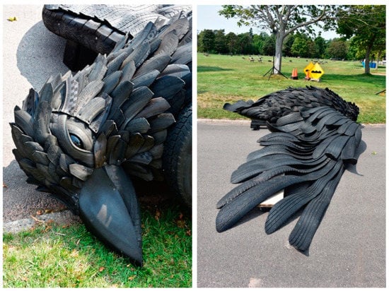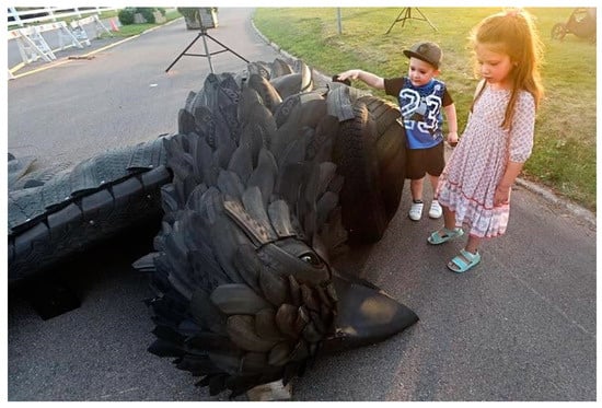 Where the Rubber Hits the Road is an example of a work that seeks to place the message of roadkill directly in the public realm (Figure 5). The piece, from Charlottetown, PEI, Canada, is by Gerard Beaulieu. This 2018 eco-art installation was placed halfway between the road and a public park and depicts a dead crow. It is intended to educate passers-by of the impact of collisions between wildlife and vehicles. Much literature surrounding roadkill has focused on human deaths []. However, more recently, research has started to be dedicated to the loss of biodiversity from roadkill []. Beaulieu’s work is concerned with the latter, placing a very large sculpture of a dead wild crow on the road.