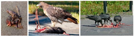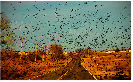 Scholars, like Stephanie R. Fishel explore how social theory can think creatively about how nonhuman animals are impacted by and require more attention from infrastructures built for human mobility []. Anthropocentric environments that are principally designed to accelerate industrialized human beings and their goods are shared with other species. These human-designed spaces have fragmented these once-continuous landscapes and ecosystems into isolated patches of natural habitat, and animals must use them when coming out of the neighboring forests. Furthermore, birds are born to travel, with their migratory patterns crossing this world. How can these roads be shared? (Figure 8).