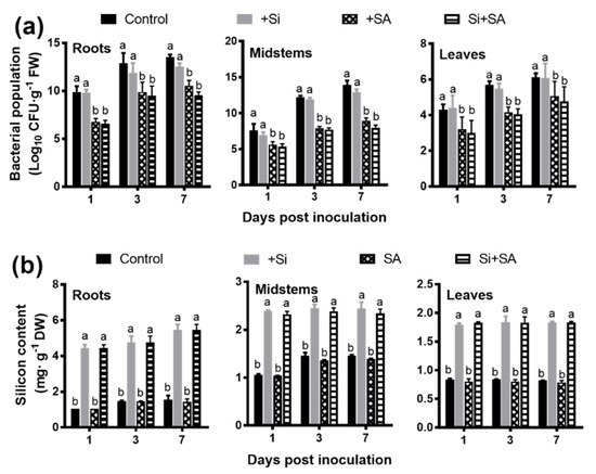 Effects of combined Si and SA treatment on bacterial numbers and silicon content in infected tomato plants. (a) Bacterial population. FW: fresh weight. (b) Silicon content. DW: dry weight. Data presented are means ± standard error (SE) of at least three independent experiments. Different letters for each day indicate values that are significantly different (p < 0.05) according to Duncan’s multiple range test.