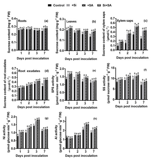 Effects of combined Si and SA treatment on sucrose concentration and activities of enzymes related to sucrose metabolism in treated plants at different time points after infection. Sucrose contents in roots (a), leaves (b), xylem saps (c) and root exudates (d) of treated plants. The SPS (e), SS (f), NI (g) and AI (h) activities in leaf extracts in the same samples. AI, acid invertase; NI, neutral invertase; SS, sucrose synthase; SPS, sucrose-phosphate synthase. Small letters indicate statistical differences among groups. Means followed by the same letters are not significantly different at p < 0.05 based on Duncan’s multiple range test. FW = fresh weight.