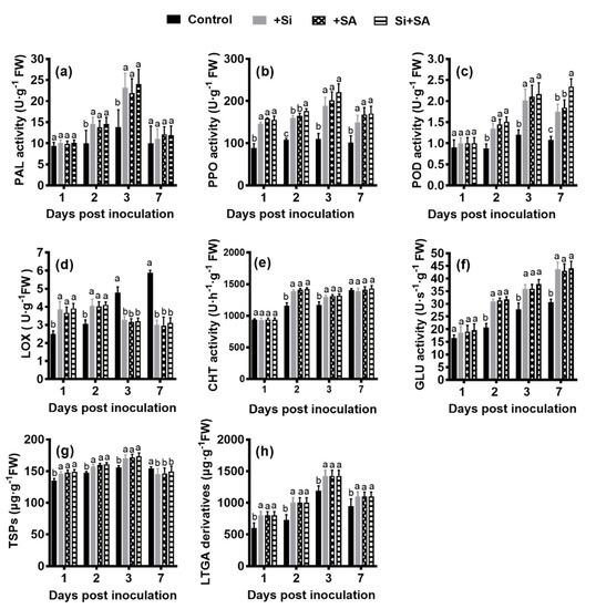 The highest level of LOX expression was observed at 1 dpi in the Si+SA treatment, and a sharp decrease was observed at 3 dpi and 7 dpi, but no significant changes in gene expression of LOX were noted between individual and combined treatments. For the control plants, the expression of LOX was induced by 2.14- to 2.40-fold at 1 dpi and was increased by 4.02- to 4.11-fold at 7 dpi when compared with the levels of corresponding time points in other treatments (Figure 6c).
