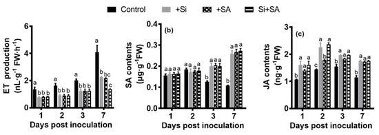 ET production increased over time in both treatments, and ET release rate of the control plants was significantly higher compared with the remaining treatments throughout the test period. In the early stage of the infection (1 dpi), the control plants emitted significantly more ET (1.37- to 2.22-fold), relative to the remaining treatments. At 7 dpi, there was significantly more ET production (1.45- to 3.44-fold) in the control plants compared with those of the remaining treatments (Figure 5a). At 7 dpi, ET release rate of the Si treatment was 1.58 to 1.71 times higher than that of the Si+SA treatment (Figure 5a).