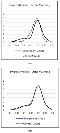 In addition, the propensity score matching needs to pass the mutual support test. James et al. pointed out that mutual support could make the matching more effective and guarantee the comparability of matching samples [23]. Meanwhile, the application of mutual support test can also avoid the subset effect put forward by Lechner [24]. The kernel density functions of samples before and after matching are shown in the following Figure 1. The dotted line represents the samples of Control Group and the full line represents the samples of Experiment Group. As indicated in Figure 1, the kernel density function curve of Experiment Group can better coincide with that of Control Group after matching. With a sufficient overlapping area, the subset effect can be avoided, and the matching effect will be better.