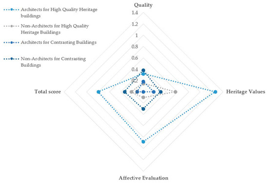 Educational background significantly affects the perceptions of built heritage value; hence, H3, indicating the relation between qualitative variables and heritage-value variables, is different for both groups. An increase in H3 is expected for architects in the case of heritage buildings and a decrease in the case of contrasting buildings for the architects in comparison to the non-architects.