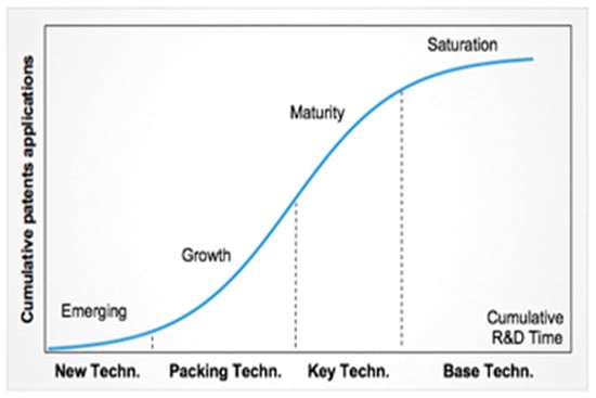 Figure 1, provided by Gao et al. [15], represents the S-curve within the category of nonlinear growth curve models, which has been extensively applied in other scientific disciplines, such as biology and medicine. For instance, Xinán and Aijun [16] identified the non-linear growth model that provides the best fit for determining the growth rate and established mathematical formulae to explore the growth intervals of a rapidly growing turbot fish strain. The technological trends were categorized into four different stages (emerging, growth, maturity, and saturation), which represent, respectively, low and high competitive impact, the key technology, and, finally, the phase at which the technology begins to be replaced, as noted by Madvar et al. [17].
