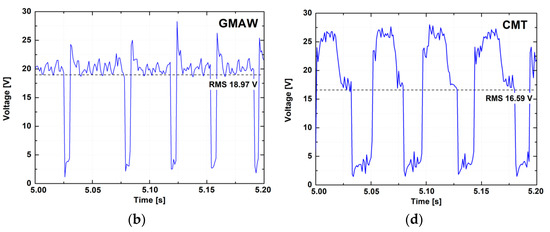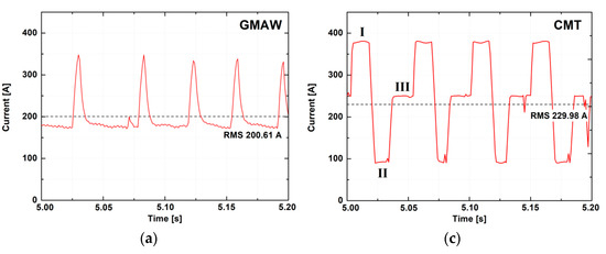 Characteristic curves of the current and voltage for standard Gas Metal Arc Welding (GMAW) (a,b); and for the Cold Metal Transfer (CMT) process (c,d).