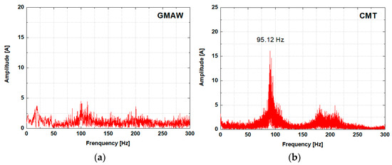Typical FFT graphs for short circuit frequencies for standard GMAW (a) and CMT (b).