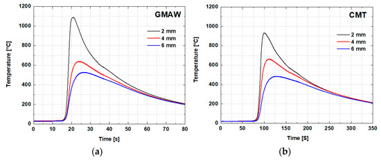The temperature distributions for the first pass of the standard GMAW and for the CMT processes are presented in Figure 4. The analyses present the temperatures registered during the welding process and the cooling rate until the base material reached approximately 200 °C. Although the temperature gradient is very high at the weld area and some errors of the thermocouple location can have great influence on the peak temperature, the thermocouple located 2 mm from the root opening registered a peak of temperature around 1090 °C for the GMAW process, while the maximum temperature for the CMT process was around 930 °C. It can be seen that the cooling times t85 (time spent between 800 °C and 500 °C) were 15.3 s (19.6 °C/s on average) and 62 s (4.8 °C/s on average) for the GMAW and the CMT processes, respectively. These differences suggest that wire deposition was more pronounced in the CMT process.