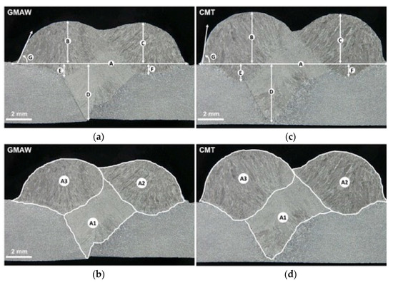 Optical macrographs showing the welding cross-section for standard GMAW (a,b); and for the CMT joints (c,d). The highlighted letters on each macrograph are the main area and dimensions related to each welding pass and are presented in Table 7.