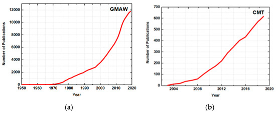 The DII patent database used in this work revealed the existence of 11,352 related patents with standard GMAW and 535 with the CMT process [50]. The distribution of the requested patents over the years can be seen in Figure 6, and the observed disparity between the numbers for each process can be considered normal since the first technology (GMAW) was launched in the 1950s, while the second (CMT) was launched in the 2000s.