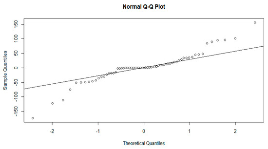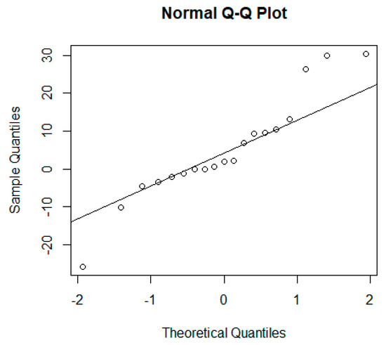 The next step was to use the Auto-ARIMA model to prepare the Ljung-Box Q statistical test proposed by Ljung and Box [55] and to test whether the series of observations (residuals from the fitted models) was random and independent over time. The R functions qqnorm(.) and qqline(.) were used to generate the curve (normal probability plot of residuals) presented in Figure 7, which showed normally distributed data along the fitting line, following the criteria of Kabacoff [27].