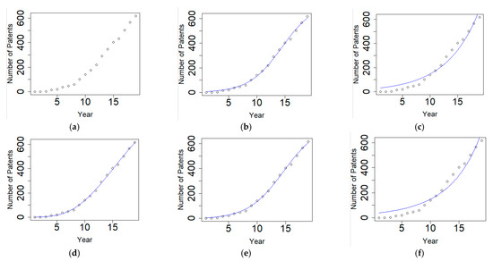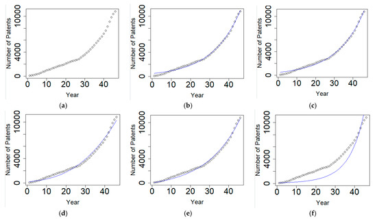 GMAW patents—Graphical analysis for the growth models. (a) Original; (b) Logistic; (c) Exponential; (d) Richards; (e) Baranyi; and (f) Gompertz.