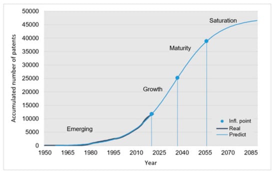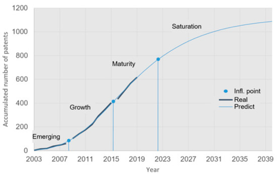 TLC analyses have been applied for different purposes and are delineated into several phases, such as embryonic, growth, maturity, and aging, as stated by Taylor and Taylor [11]. Wilder et al. [12] showed that S-curve models can facilitate the understanding of change dynamics, reveal patterns and technological changes, and serve as tools combined with growth models to predict inflection points and thus establish monitoring strategies. The model proposed in this study originates from the established S-curve concept proposed by Little [13] to measure technological changes and provide an analytical method for the adaptation of strategic planning techniques to manage corporate R&D resources. In addition to the TLC study, it is essential to note that the use of patents is an important strategy to study and explore the forces that drive sustainable development, as the study of Wu et al. [14] addressed.