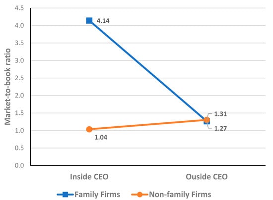 Nonetheless, this is not the end of the story. It is worth noting that the above negative effect of family involvement is just a partial effect: a portion of the effect left after all other contingent effects are partialled out [106,113]. To have a more complete understanding, we analyze it in tandem with the contingencies. Interestingly, according to our post hoc analysis, family firms outperform non-family firms as long as they are managed by inside CEOs who are knowledgeable about every detail of their firms, not to mention the firms’ valuable resources and capabilities not readily observable by outsiders. Therefore, the family still has a chance to contribute to its firms by having inside CEOs instead of outside ones. However, this decision may not work as expected when firms undergo substantial business fluctuations because outside CEOs have diverse knowledge and information and external networks more pertinent to dealing with such situations.