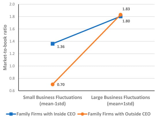 In Figure 2, we exhibit the effect of business fluctuations on the moderating effect of inside CEOs on the relationship between family firms and the market-to-book ratio. Family firms managed by inside CEOs outperform those managed by outside CEOs by a large margin (0.66 = 1.36−0.70) when their business fluctuations are small. On the contrary, when their business fluctuations grow larger, family firms managed by inside CEOs fall behind those managed by outside CEOs. Therefore, both graphs confirm that the moderators shift the theorized relationship in the predicted directions within the data range of our sample.