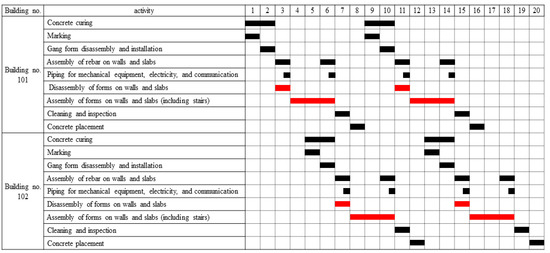 A typical floor construction plan is established mainly based on formwork, which accounts for a large proportion of the entire project, as shown in Figure 2. The cycle per floor is generally 8 days. However, based on working days vs. non-working days, 10 to 12 days are generally required [14]. Hence, the formwork crew is generally tasked with three buildings simultaneously to minimize idle time and to facilitate efficiency. Therefore, the construction period for apartments consisting of two or more buildings should be calculated in consideration of lead–lag relationships between work units, the number of actual working days, the number of non-working days, resource allocation, and idle time.