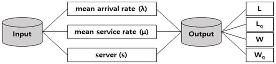 Performance criteria for the queue system can be derived based on the mean arrival rate, the mean service rate, and the server, as shown in Figure 4. Performance criteria are classified using the following four criteria according to whether only customers waiting for the queue system are considered, or whether a customer receiving services in the queue system is also considered.