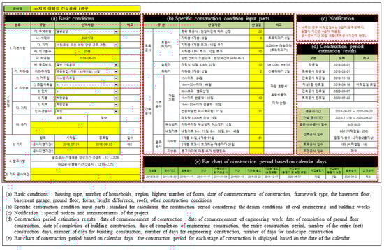 Figure 5 shows an Excel-based construction period estimation tool, which has been applied to apartment construction projects ordered by LH. This tool can be used easily because it calculates the construction period from basic project information (e.g., region, dates, households affected, and number of floors). However, it exhibits limited performance regarding the uncertainty that can occur during construction, given that it calculates the period based on the number of floors of the highest building, regardless of the project scale, as shown in Figure 6. Thus, the construction period according to construction sections and the entire amount of work was quantitatively analyzed based on the performance data of apartment frame construction projects ordered by LH.