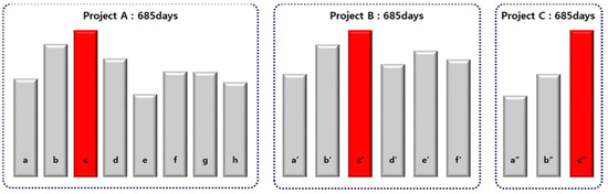 Table 2 indicates details of the most common project types executed by LH, which are comprised of eight apartment buildings of 450 households with areas of exclusive use of 59 or 84 m2. The entire construction period for this project was planned for 846 days, and the apartment frame construction period was planned for 336, based on the number of floors in the highest building (19), and non-working days were considered. The construction periods for the basement floor, the ground floor, and the typical floor were planned to take 84, 26, and 226 days (12.5 days per floor), respectively.